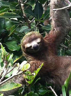 So I sat and watched him. He just hung there, would reach out to grab a branch or a leaf in what looked like a slow-motion movie. I watched him sniff a couple leaves, then open his mouth and bite down on one, then let go of that branch and go back to chewing and hanging around. We had plans that morning which interrupted our sloth-viewing session or I would have stayed and watched for a while. They move so slowly and so deliberately, or so it seems. Their moves seem so well thought out, every millimeter planned and executed with precision. We later learned that they only go to the bathroom once a week and to do that they come down from the trees.
